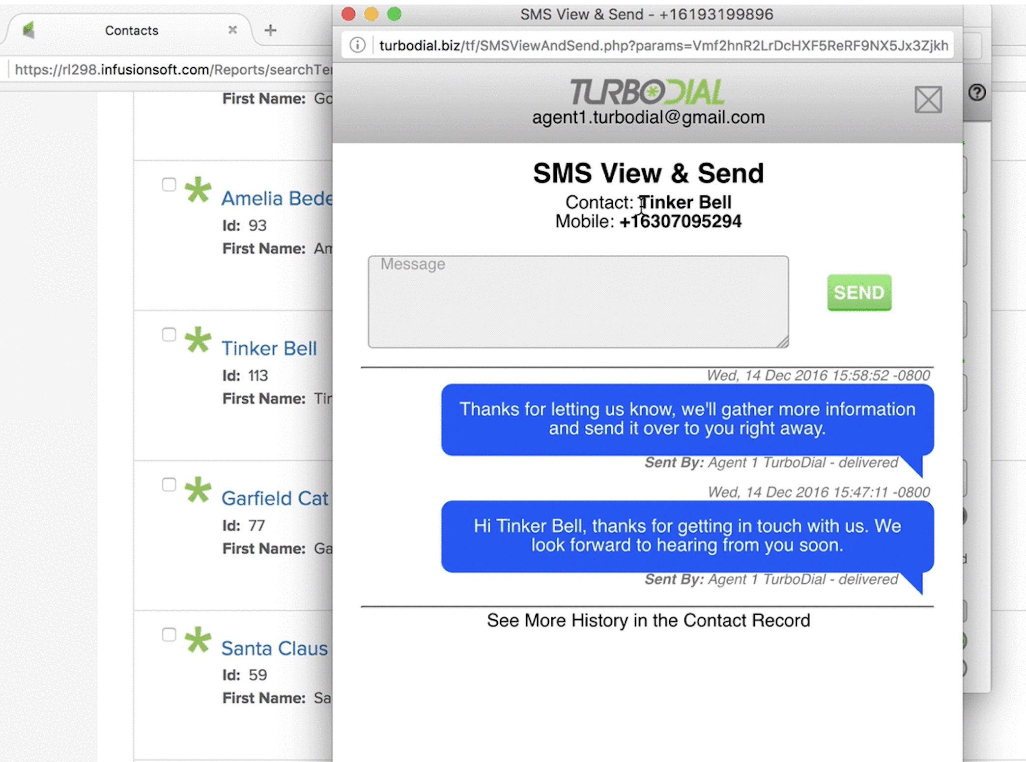 turboDial comes with a browser extension that you can plug in to your Firefox or Chrome browser, and then your key Keap pages will show the turboDial green asterisk next to the contact - just click it to make a turboDial call. The button appears on Contact views, Opportunity views, Search Listings and My Day pages. Other phone calling apps for Keap require you to transfer your contact lists and shift your attention over to their complex websites. With turboDial, there’s no need to leave Keap – place a phone call or send a text message to any contact at any time.