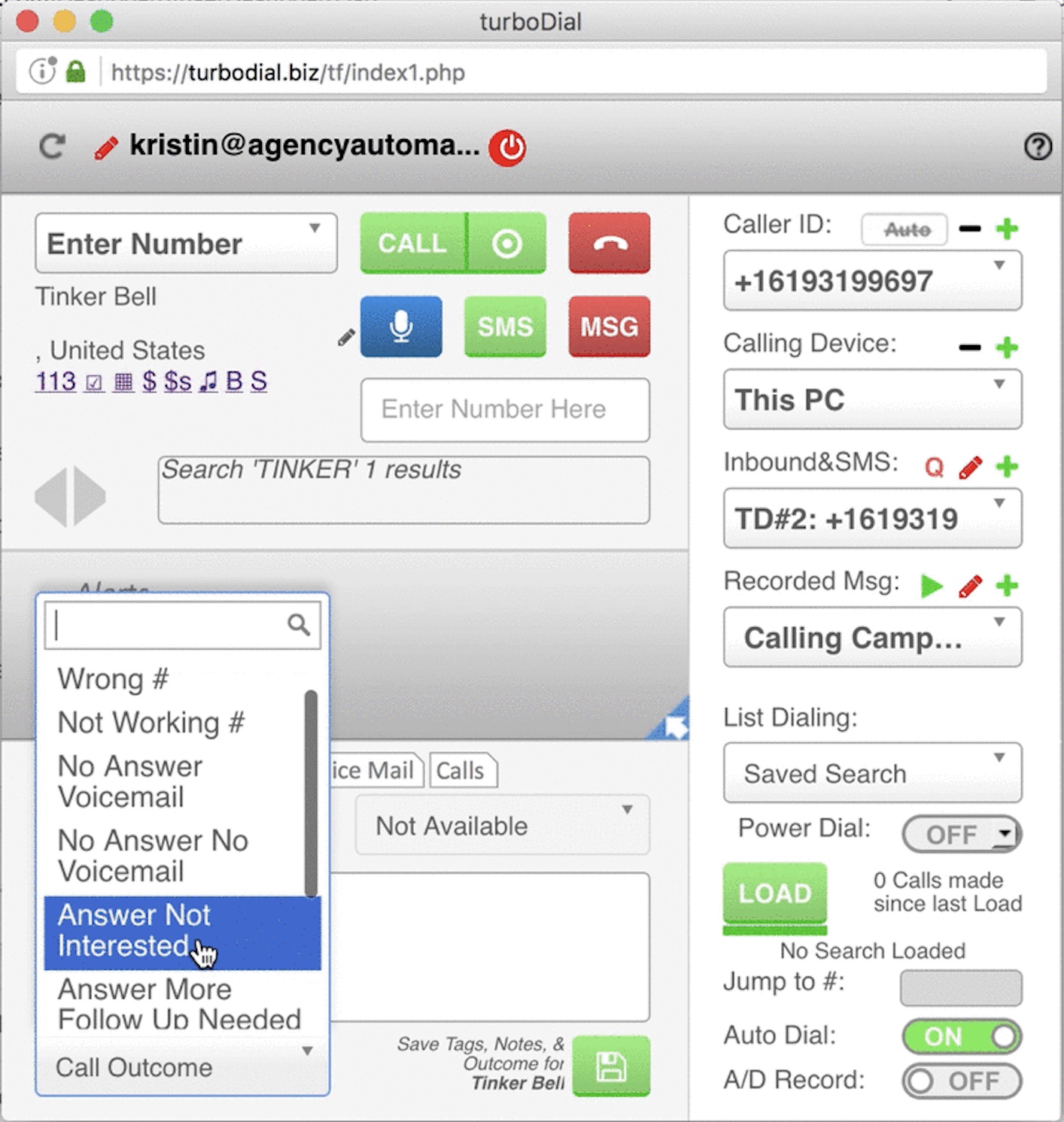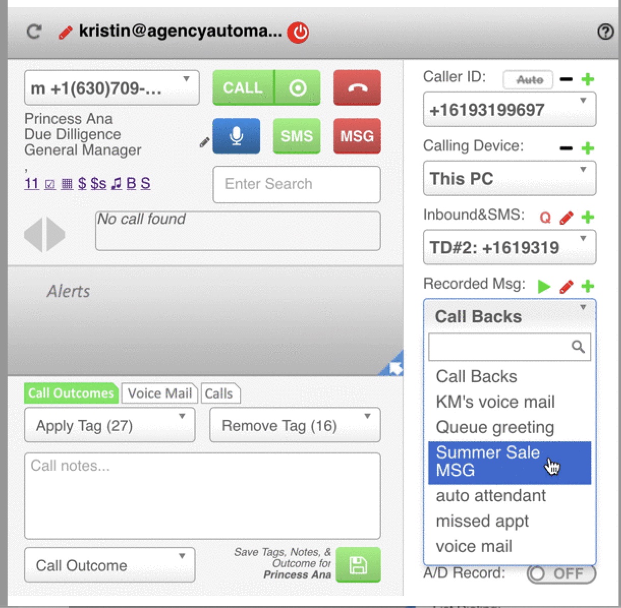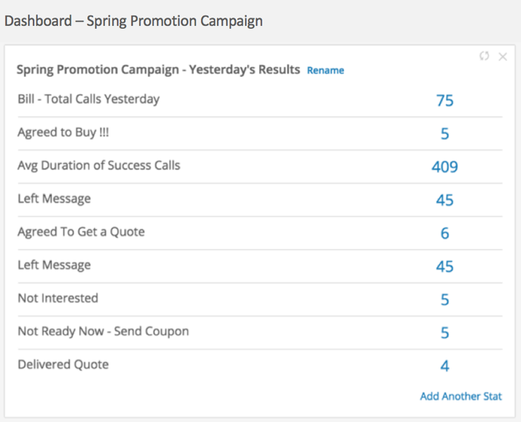 The “Call Outcome” selector is easily customized to offer the choices that best represent your unique business needs. Then each Call can be easily assigned an disposition – thereby creating a data trail you can use for powerful dashboard reporting. And each Outcome can trigger an associated campaign
