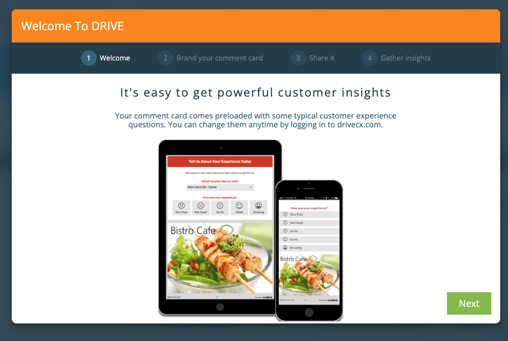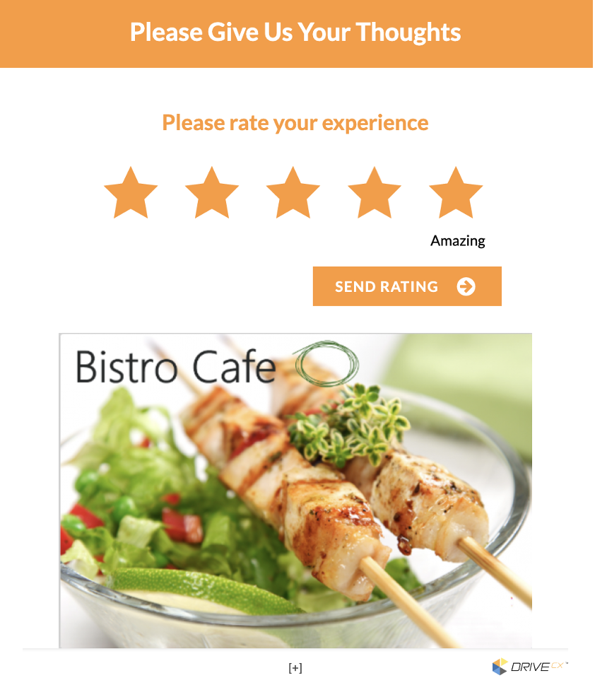 Add your logo, opening image, advertising image and brand colors to create your custom comment card. Choose your questions - rating comments, NPS, marketing, operations and any multiple choice and text question.