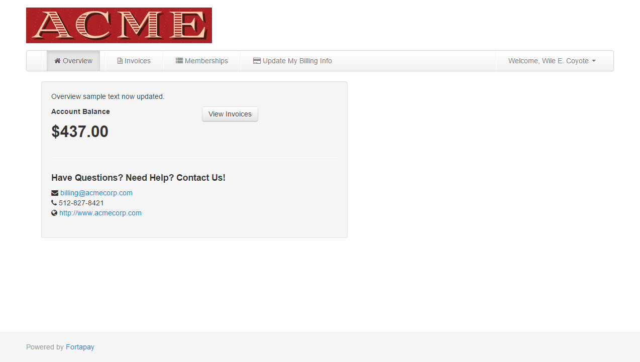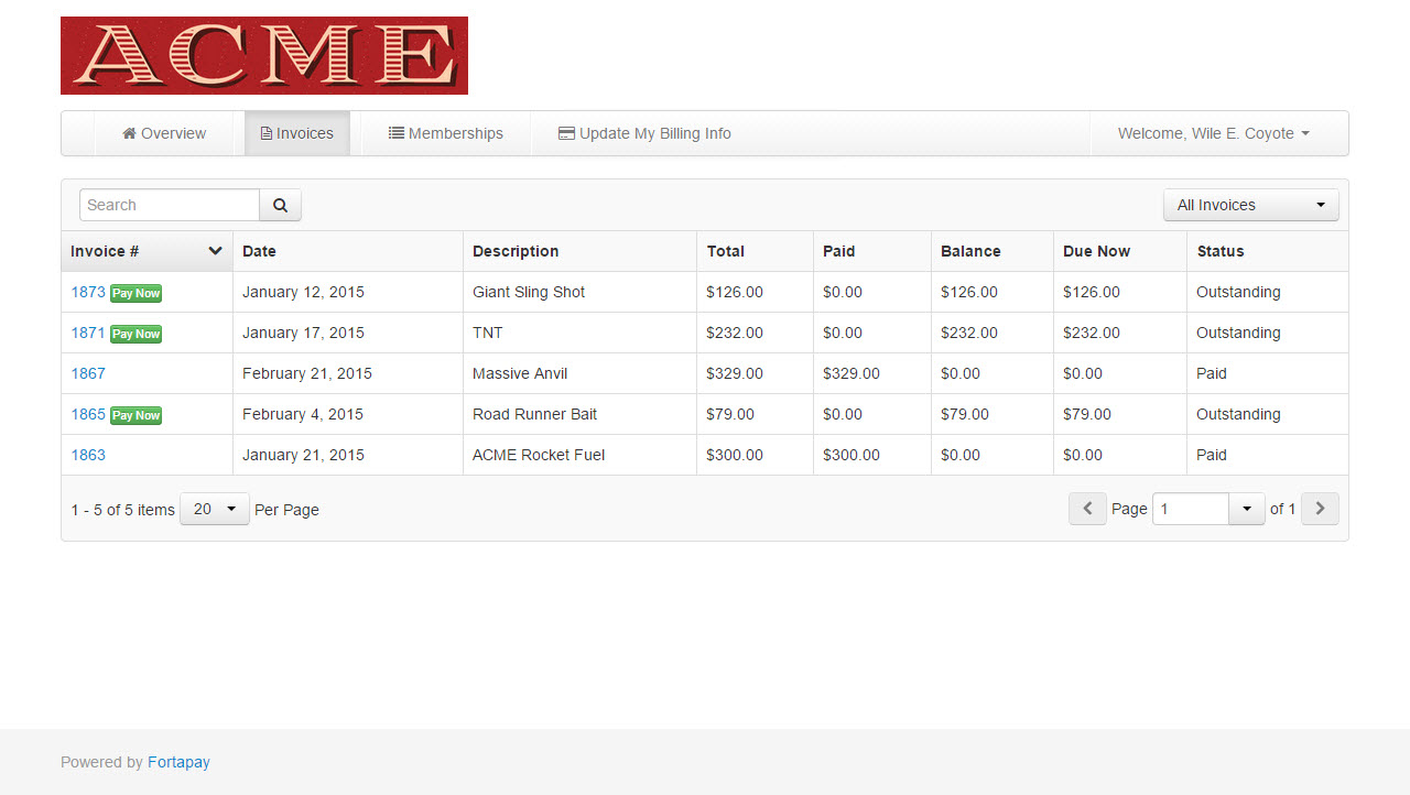 Your customers can conveniently view their total outstanding balance of all unpaid invoices when logged into your Fortapay-powered Billing Center.
