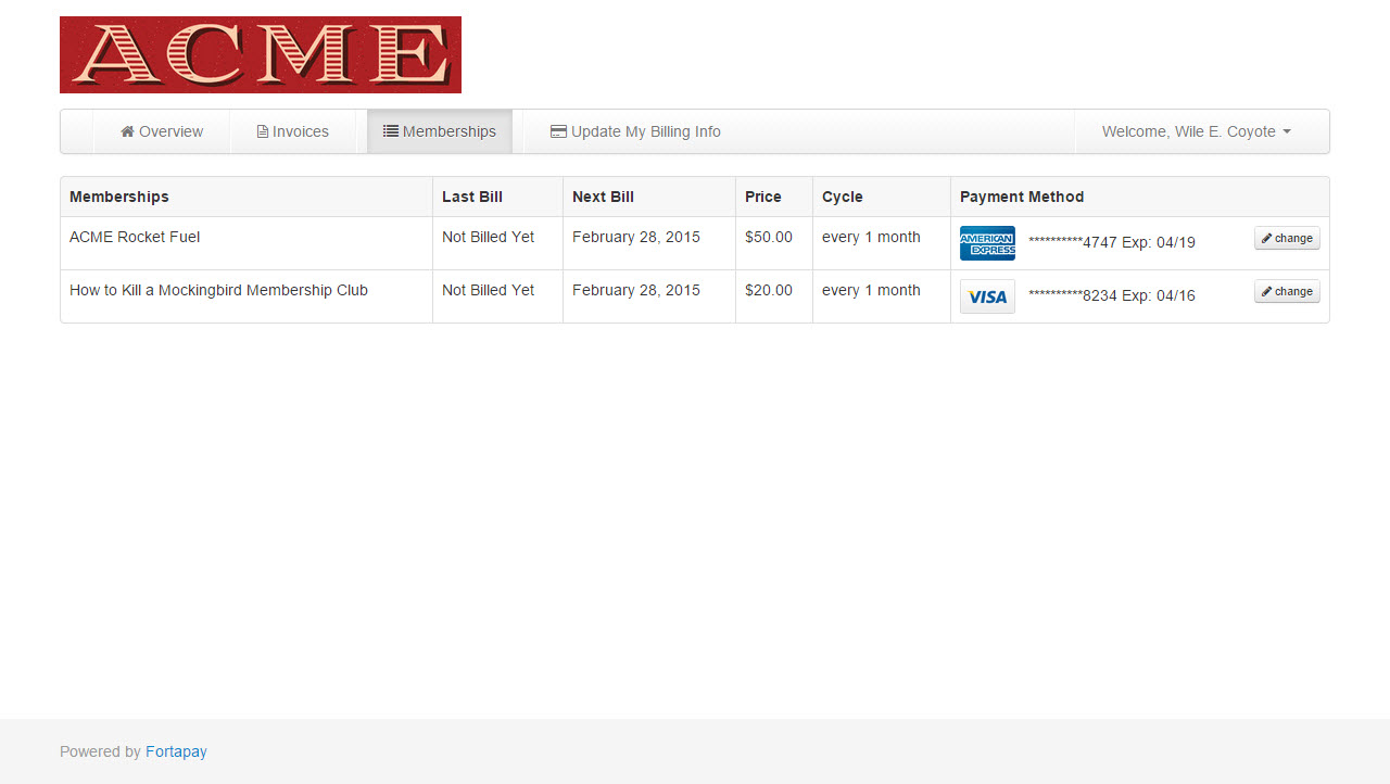 Your customers can view and manage all subscriptions/auto-charges. They can view billing dates, see which card is associated with each subscription and make changes to billing information and credit cards associated with their subscriptions. You have complete control over which fields your customers can update.